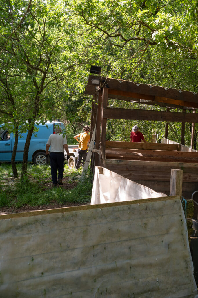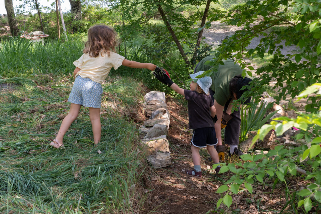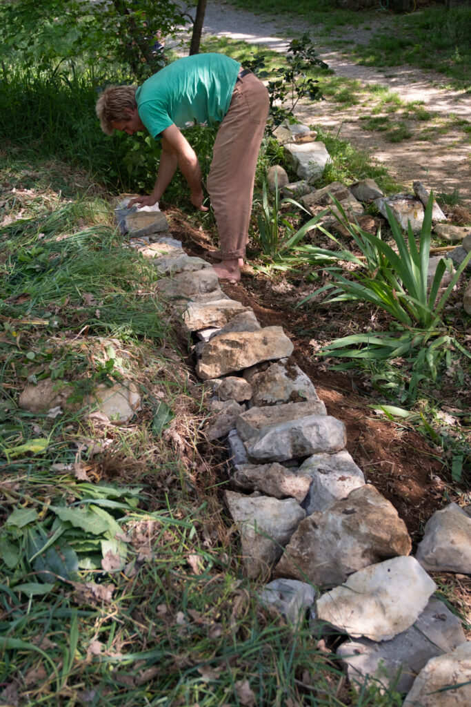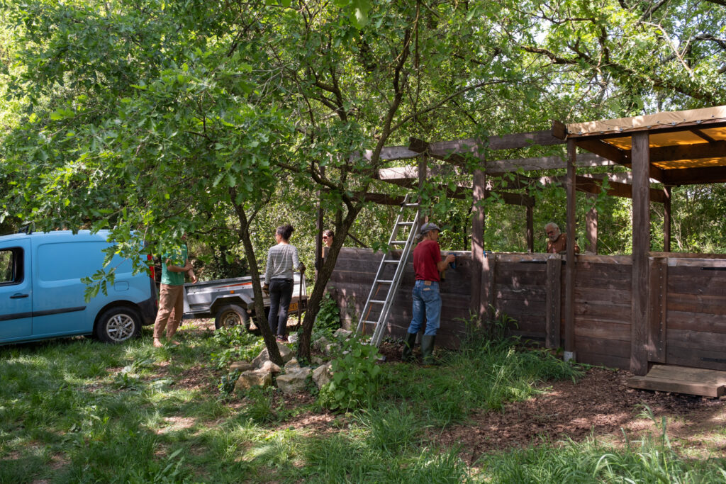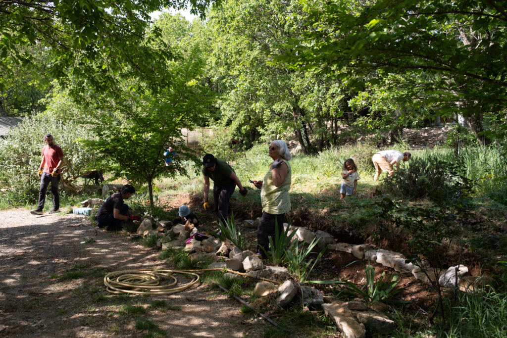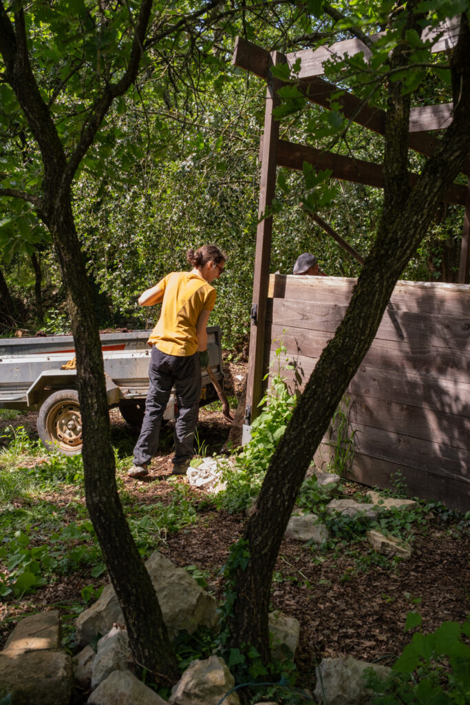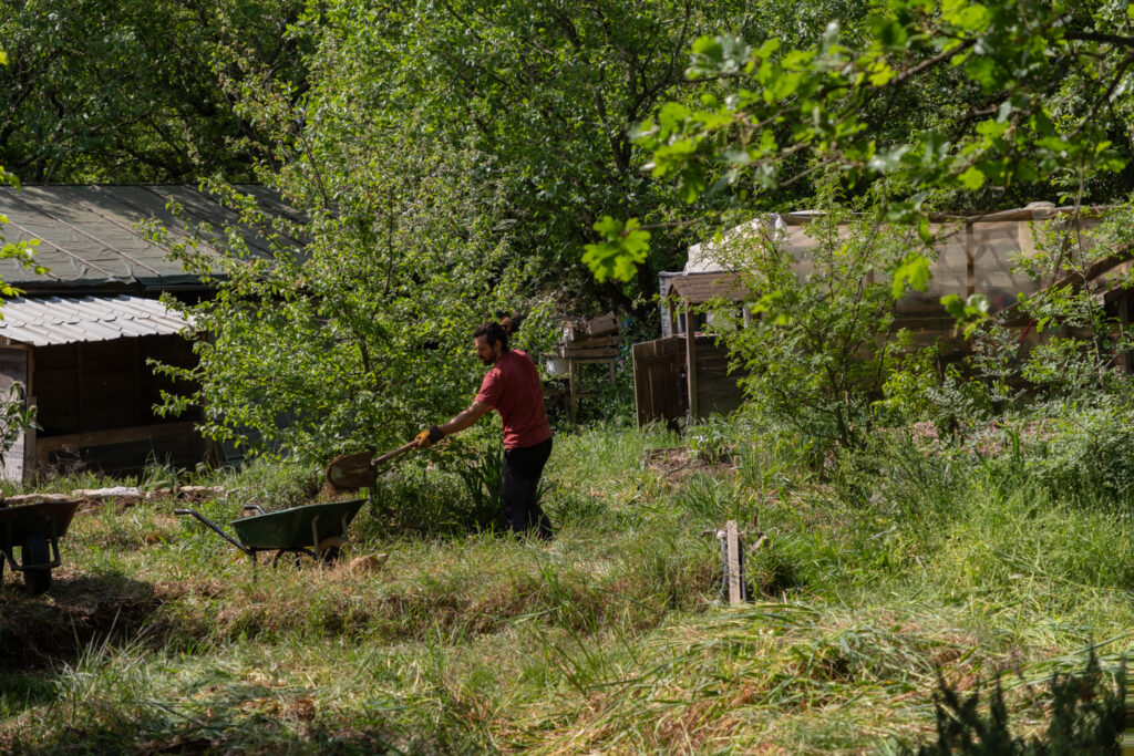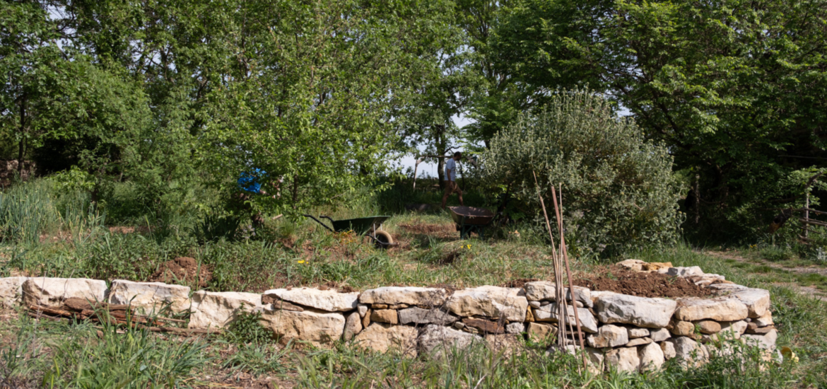 Ce week-end, nous avons organisé l’un de nos week-ends d’immersion semestriels. Dans le cadre de cette immersion, nous avons passé une matinée à travailler ensemble lors d’un chantier participatif dans les jardins communs. L’un de nos projets actuels consiste à rénover et à redynamiser les jardins communs. Cela comprend la construction de murs en pierre pour mieux retenir la terre dans la zone, ainsi que le creusement d’un bassin qui permettra de recueillir naturellement l’eau de pluie. Ce fut un vrai plaisir de travailler ensemble sous les voûtes de verdure qui sont en pleine floraison printanière. L’ambiance était au beau fixe et tout le monde a bien transpiré ! Merci à tous les visiteurs en immersion pour leur énergie. Nous avons hâte de vous montrer comment le projet de jardin évoluera à l’avenir.